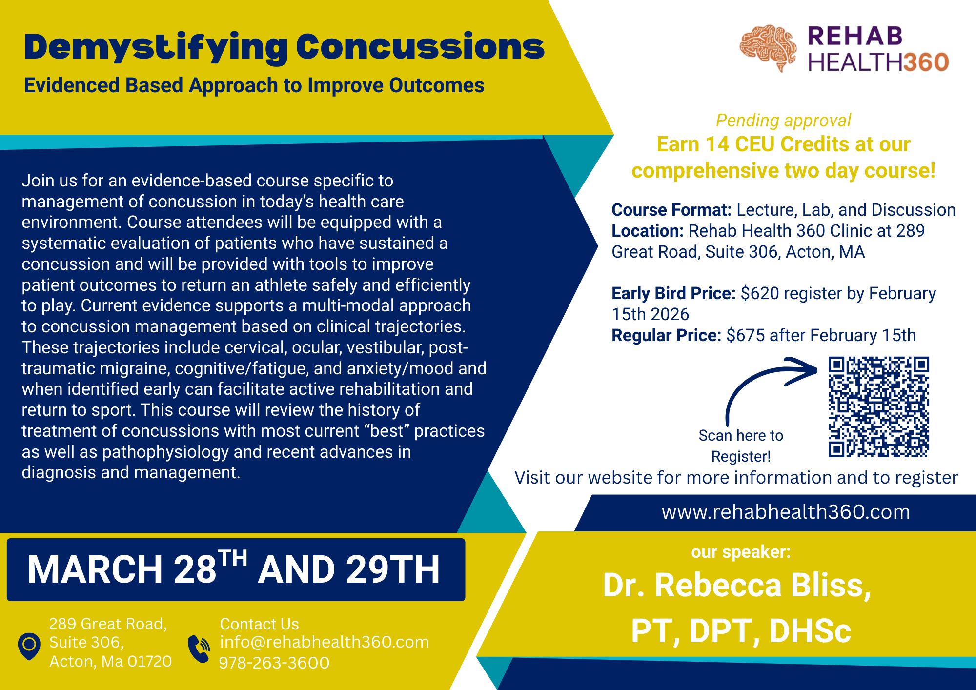 For any additional questions about the Concussion Rehabilitation course, please email us info@rehabhealth360.com or call 978 263 3600